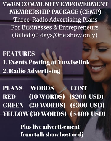 YWRN COMMUNITY EMPOWERMENT MEMBERSHIP PACKAGE (CEMP). Three radio advertising plans for businesses and entrepreneurs. RED Plan. GREEN Plan. YELLOW Plan. Billed 90 days/one show only.